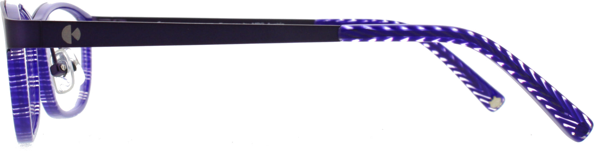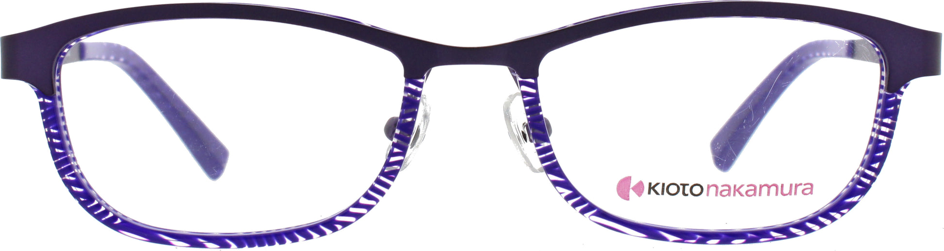Leichte kleine Kunststoffbrille mit einer Browlinie aus Metall. Hübsch in lila verpackt die Brille von der japanischen Marke Kiotonakamura.