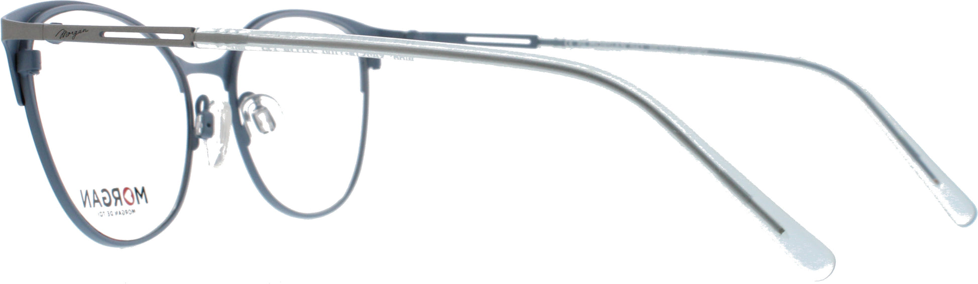 Weibliche Metallbrille für Damen von der Marke Morgan im Schmetterlingsstil. Die Bügel sind zum Teil aus Metall mit einem Kunststoffüberzug. Der untere Teil der Front ist in silber-blau gehalten. Alle Brillen erhalten Sie auch als Sonnenbrille mit Sehstärke.