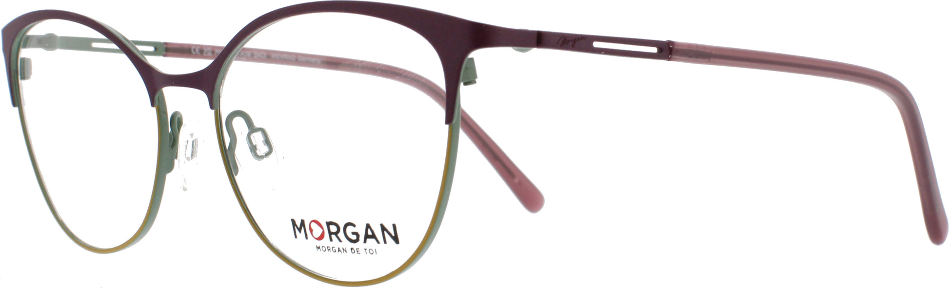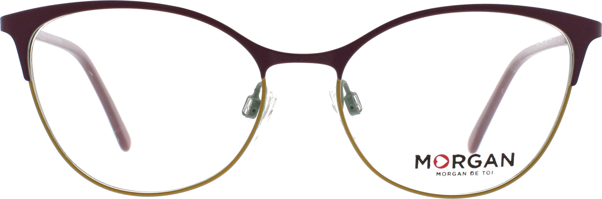 Weibliche Metallbrille für Damen von der Marke Morgan im Schmetterlingsstil. Die Bügel sind zum Teil aus Metall mit einem Kunststoffüberzug. Der untere Teil der Front ist in beige gehalten. Alle Brillen erhalten Sie auch als Sonnenbrille mit Sehstärke.