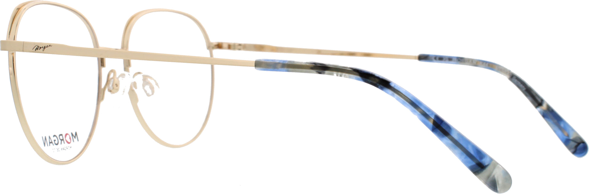 Hübsche schlichte Metallbrille für Damen von der Marke Morgan. Die Fassung ist blau und gold. Die Bügel sind zum Teil aus Metall mit einem Kunststoffüberzug.