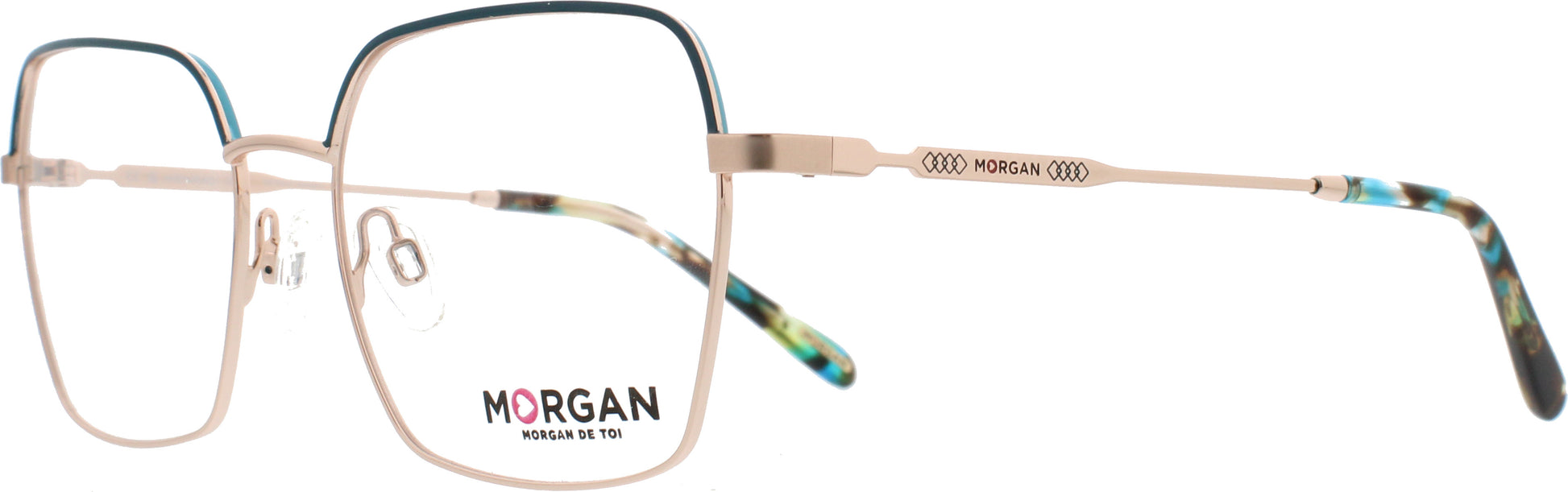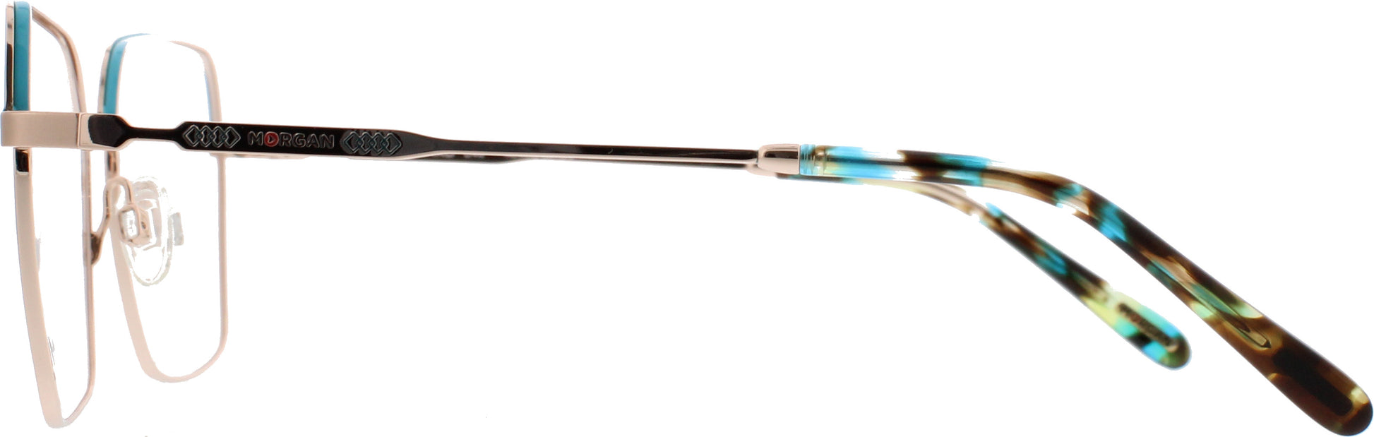 Weibliche Metallbrille für Damen von der Marke Morgan im Schmetterlingsstil. Die Bügel sind zum Teil aus Metall mit einem Kunststoffüberzug. Der untere Teil der Front ist in roségold gehalten. Die Browline ist blau. Alle Brillen erhalten Sie auch als Sonnenbrille mit Sehstärke.