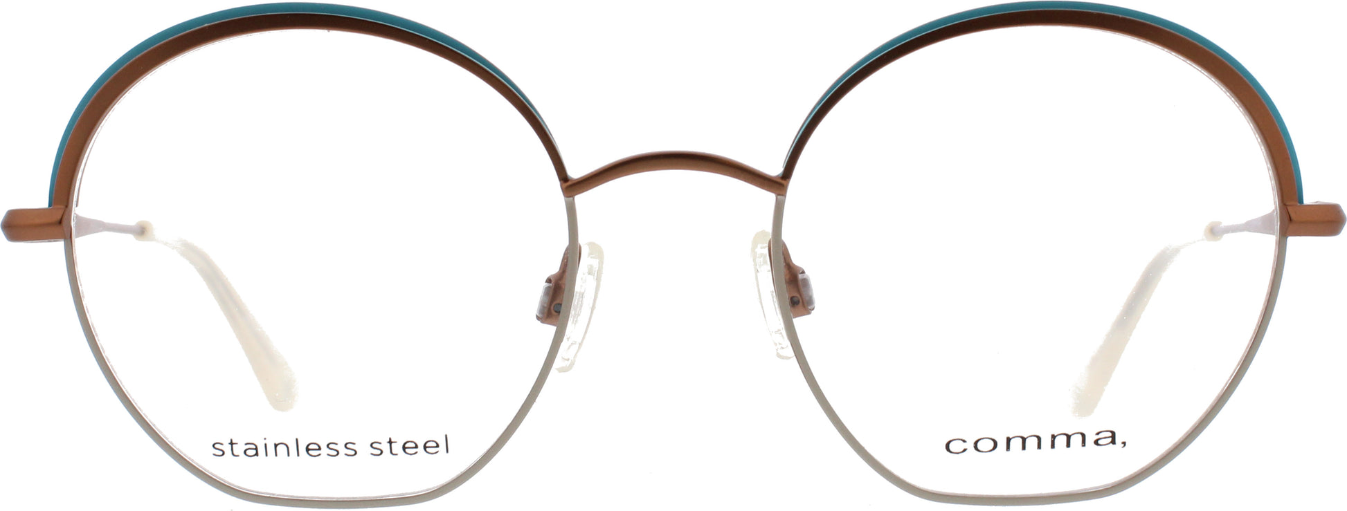 Diese elegante Comma Damenbrille vereint modernes Design mit feinen Farbakzenten. Die großzügige, leicht eckige Form mit sanft abgerundeten Kanten sorgt für einen ausdrucksstarken, dennoch femininen Look. Gefertigt aus hochwertigem stainless steel (Edelstahl) überzeugt die Fassung durch Stabilität, Langlebigkeit und ein angenehm leichtes Tragegefühl. Besonders stilvoll wirkt die zweifarbige Gestaltung: Der obere Rahmen in Türkisl setzt einen modischen Akzent, während die warmen Braun- und Kupfertöne im unteren Bereich für Harmonie und Eleganz sorgen. Die filigrane Metallkonstruktion mit verstellbaren Nasenpads garantiert optimalen Sitz und hohen Tragekomfort.